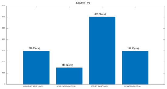 Comparison was made between the original Resnet and its compressed counterpart in terms of the model weight size and performance (accuracy) in Table 4. The weight size of the compressed model registered a remarkable decrease from 743 MB to 76 KB (1/10,000), whereas its performance was almost the same as its original counterpart. In addition, a comparison was made between Resnet and Mobilenet in terms of the six performance measures in Table 5 and Figure 4. The two models were similar in terms of accuracy, i.e., Resnet-50 Hz (97.3) vs. Mobilenet-50 Hz (97.2), Resnet-100 Hz (98.2) vs. Mobilenet-100 Hz (97.9). Here, 50 Hz/100 Hz denotes the down-sampling rate. This similarity remained intact in terms of the other performance measures as well: e.g., 98.1 vs. 97.7 (F1 score), 99.1 vs. 98.3 (sensitivity/recall), 97.5 vs. 97.6 (specificity), 97.1 vs. 97.2 (precision), and 99.6 vs. 99.7 (AUC) regarding Resnet-100 Hz vs. Mobilenet-100 Hz for the test set.