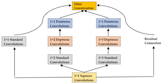 A rare attempt was made to use a “lightweight” convolutional neural network (Litenet) for the classification of arrhythmia and achieved the accuracy of 97.78% in the inference time of 25 microsecond [23]. Here, the term “lightweight” means the size of input image and/or the number of its channels were reduced as in Mobilenet. The core of Litenet is the Lite module, a modified version of the inception module with two distinctive characteristics, i.e., (1) the kernel sizes of 1 × 1, 1 × 2 and 1 × 3 and (2) depth-wise and point-wise convolutions, which reduce the size of the input image and the number of its channels (Figure 8). ECG data for this study came from the MIT-BIH Arrhythmia Database with 109,449 samples from 48 unique participants. These samples were augmented and oversampled to achieve a balance between normal and arrhythmia categories. Then, five deep learning models were compared in terms of accuracy and inference time: Alexnet, Googlenet, Litenet, Mobilenet and Squeezenet. Litenet ranked third in accuracy and first in inference time.