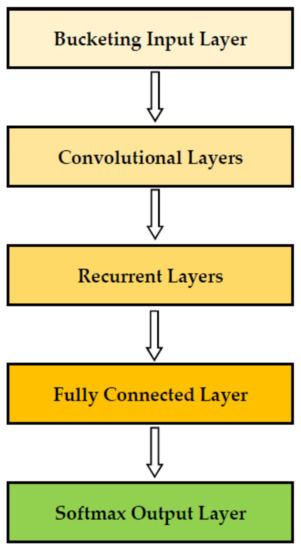 Another study employed a lightweight recurrent neural network for the diagnosis of arrhythmia and recorded the accuracy of 99.80% in the inference time of 3 min [25]. This study developed the fused lightweight recurrent neural network module: combination of convolutional layers and the simplest (Vanilla) recurrent layers to achieve efficiency and accuracy at the same time (Figure 9). ECG data for this study also came from the MIT-BIH Arrhythmia Database with 48 unique participants. Their samples were undersampled to achieve a balance between normal and arrhythmia categories. However, these studies relied on a public dataset (MIT-BIH Arrhythmia Database) and their inference was carried out in personal computers, not in an embedded wearable device. For this reason, this study developed efficient deep learning with model compression, which is designed to use ECG data and classify arrhythmia in an embedded wearable device. To the best of our knowledge, this is the first study in this direction.