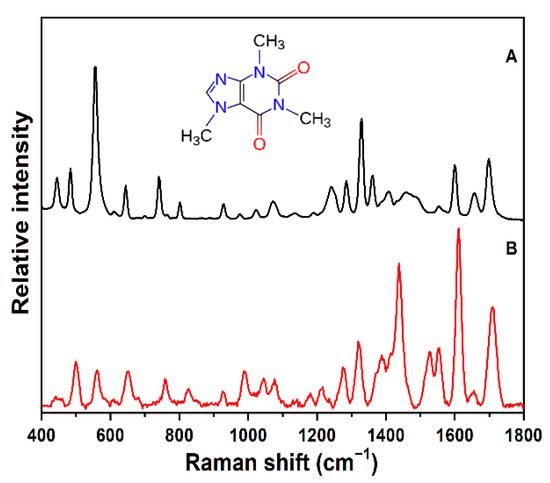 - Chen, X.; Gu, H.; Shen, G.; Dong, X.; Kang, J. Spectroscopic study of surface enhanced Raman scattering of caffeine on borohydride-reduced silver colloids. J. Mol. Struct. 2010, 975, 63–68. [Google Scholar] [CrossRef]