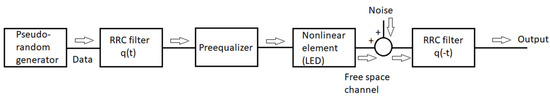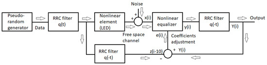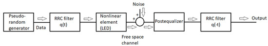 The present paper compares the pre- and post-equalizer performances in terms of the received signal quality for a channel that includes a nonlinear element of limited bandwidth, such as LED. We selected multilevel Pulse Amplitude Modulation (PAM) as the signal format due to its relative simplicity. There were many types of equalizers to choose from for our comparison, but we selected the so-called reduction-based Volterra series equalizer [13,14]. One reason for that was that it was general enough and able to compensate for dynamic nonlinearity [3]; the other reason was that the number of coefficients used (computation complexity) was much lower as compared to the “classical” Volterra series approach [14]. The nonlinear element (e.g., LED) was modeled by the Wiener–Hammerstein device [15]. The selection of such a model followed from its relative simplicity and ease in separately varying its bandwidth and nonlinearity, as well as from the fact that there is no direct relation between the coefficients of the Wiener–Hammerstein and Volterra models. The comparison of the pre- and post-equalization schemes was conducted in [16] for direct current-biased optical–orthogonal frequency division multiplexing (DCO–OFDM). However, in such a system, the pre-/post-equalization is understood simply as the channel gain division between the transmitter and receiver. Therefore, the results of [16], although interesting, cannot be directly applied here.