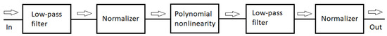where T is the symbol period and α is the so-called roll-off factor. We used over-sampling with 10 samples per transmitted symbol. The signal after convolution was fed to a device with dynamic nonlinearity, which simulated the nonlinear element, such as an LED, in the transmission channel. A block schematic of this device is depicted in Figure 2.