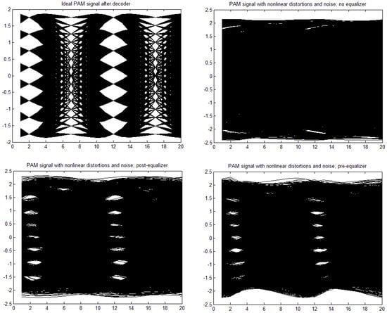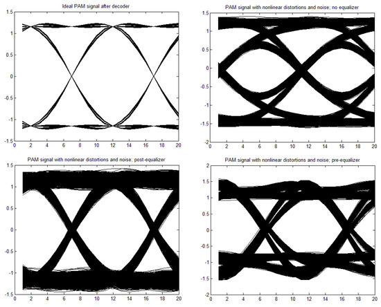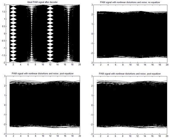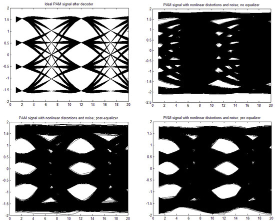 [a,b,c,d] = [1, 0, 0, 0], through moderate nonlinearity [a,b,c,d] = [1, −0.1, 0.05, 0.02] to strong nonlinearity [a,b,c,d] = [1, 0.3, −0.15, −0.06]. The time constant in the Wiener–Hammerstein element was also changed, as well as the roll-off factor, α. Exemplary eye patterns obtained for the moderate nonlinearity, roll-off factor α = 0.3, τ = 0.3 T (T is the symbol time duration), and SNR = 20 dB are depicted in Figure 5, Figure 6, Figure 7 and Figure 8 for all PAM modulations applied. One can readily observe that, in the ideal case (lack of noise and nonlinearity), the separation of transmitted symbols is possibly independent of the number of modulation levels. However, if the distortions are added, the correct reception is possible only for PAM-2, unless the equalizer is applied. The application of a pre/post-equalizer considerably improved the eye patterns for two, four, and eight modulation levels, which is particularly visible for PAM-4. However, for PAM-16, even the post/pre-equalizer does not give an open eye pattern. For the used parameters set, it appears that the post-equalizer performs slightly better than the pre-equalizer.