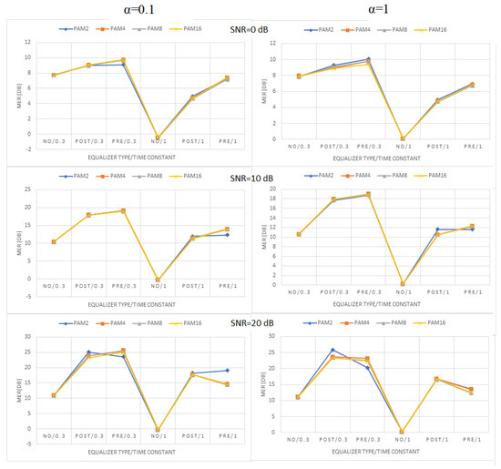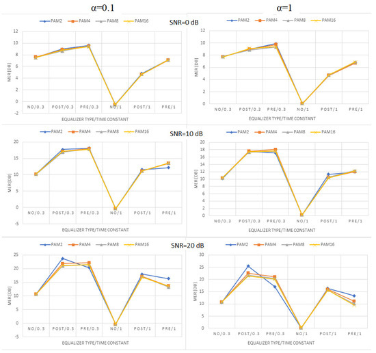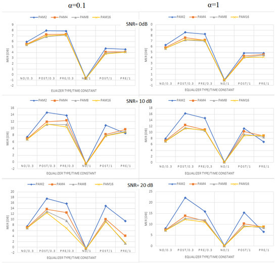 Figure 9, Figure 10 and Figure 11 present the values of MER obtained for linear, moderately nonlinear, and highly nonlinear elements, respectively. They are shown for all modulations used (PAM-2, …, PAM-16), roll-off factors α = 0.1 or 1, time constants in the Wiener–Hammerstein element τ = 0.3T or T, and receiver signal–to–noise ratios SNR = 0 dB, 10 dB, or 20 dB. The MER values for pre- and post-equalization are depicted and also the MER values when no equalization is applied for the sake of comparison.