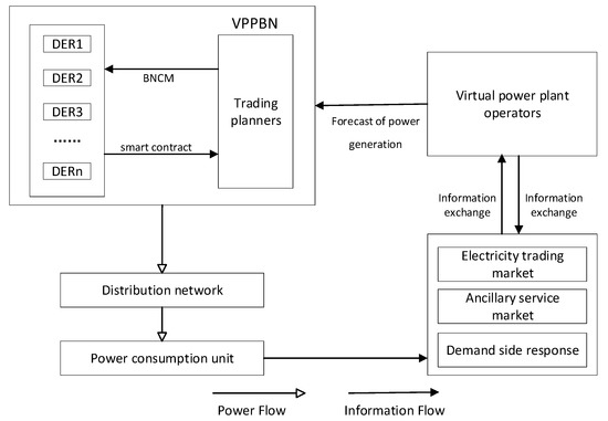 Therefore, in order to realize the transparency of information and benefit exchanges between DERs and VPP operators, this paper presents an improved virtual power plant trading model (VPPTM), through which the DERs in the virtual power plant construct the flow of transactions. Section 1 of this chapter introduces the overall structure and operation process of VPPTM, and Section 2 introduces the VPPBN that relies on blockchain technology to achieve DER collaboration in the VPPTM.