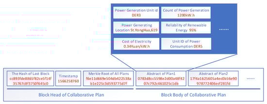 The structure of the collaborative planning block is shown in Figure 4. The listener of the collaborative plan includes the hash value of the previous block, the timestamp when the collaborative plan packager was packaged, and the Merkle root of the collaborative plan block. All generation plan information recently occurred in the VPPPN is stored in the block body, which includes ID, power generation quantity, location, transaction price, etc.