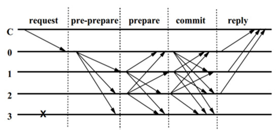 The number of invalid or malicious nodes tolerated by the PBFT algorithm is f. In order to ensure the normal operation of the entire system, the PBFT algorithm needs to have 2f + 1 normal nodes. Therefore, the total number of nodes in the system is 3f + 1. In other words, the PBFT algorithm can tolerate less than 1/3 invalid or malicious nodes. The consensus process of the PBFT consensus algorithm is divided into five stages: request, pre-preparation, preparation, submission, and response [28]. Figure 5 shows the execution process of the PBFT algorithm. The specific implementation process is shown below.