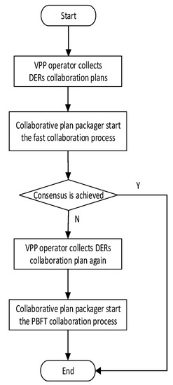 The blockchain network collaboration mechanism (BNCM) in VPPBN is composed of the fast consensus stage and the practical byzantine fault tolerance (PBFT) consensus stage. The overall operation logic of the BNCM is shown in Figure 6. Each DER reaches a consensus through the fast consensus stage. Compared with the traditional PBFT algorithm, DERs can reach a consensus quickly in this stage. If the fast consensus stage is unsuccessful or times out, the PBFT consensus algorithm is used in the PBFT consensus stage to reach a consensus.