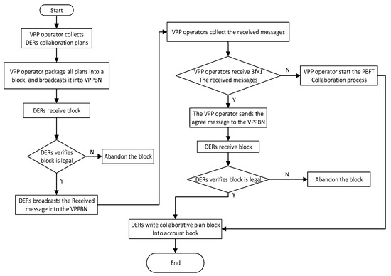 When VPPBN is running, the VPP operator is responsible for packaging the transaction plan block. Each DER participates in the energy bidding on the VPPBN, and the smart contract is automatically executed when the smart contract trigger condition is reached. In VPPBN, both parties involved in the transaction will disseminate the transaction plan that has been reached. Finally, the DERs reach a consensus on the validity of this transaction plan through the blockchain network collaboration mechanism (BNCM) proposed in this paper. After a specified time, VPP operators will package all transaction plans in this period into transaction plan blocks and spread them on the VPPPN. Each DER verifies the legality of the transaction plan block containing all the transaction plans at the specified time. If it is legal, the block is stored in its own ledger, and if it is illegal, it is discarded.