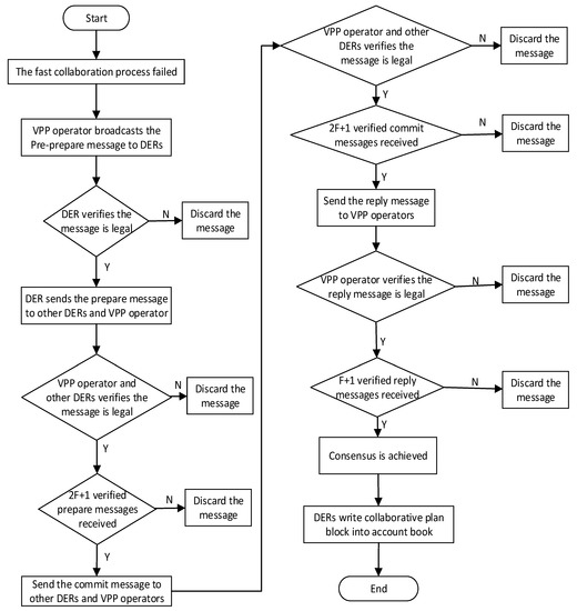 The blockchain network collaboration mechanism (BNCM) in VPPBN consists of the fast consensus stage and the PBFT consensus stage. Each DER first reaches a consensus through the fast consensus stage, and the flow chart of this stage is shown in Figure 7. If there are malicious nodes that make it impossible to successfully reach a consensus in the fast consensus stage, each DER then reaches a consensus through the practical Byzantine fault tolerance consensus stage. The flowchart of the PBFT consensus stage is shown in Figure 8.