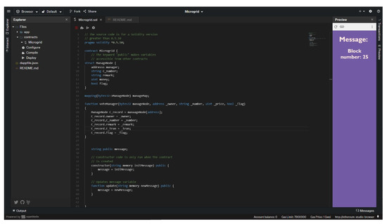 The pseudocode of this smart contract is shown in Table 2. There are three roles in the process of power transaction: power supplier, power user, and message maintainer. In the smart contracts of this section, power suppliers and power users refer to DERs who participate in completing a transaction, and message maintainers refer to VPP operators. When a smart contract is deployed to the Ethereum blockchain, it first needs to be compiled into machine language, and then the address of the smart contract is broadcast between VPPTM. When the smart contract is built, it will automatically call the instantiation functions of the three roles to realize the encapsulation and automatic execution of the block. The triggering condition of the smart contract is reached when the power user, the power supplier, and the message maintainer call their respective contract functions. At this time, the smart contract will be executed automatically. We use Ethereum Studio as programming tool in order to make the program more convenient, and the interface of programming is shown in Figure 9.