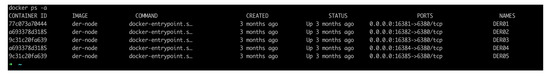 As shown in Figure 11, multiple containers are started through Docker to simulate the communication between DERs. In this experiment, the format of messages sent between DERs is specified as < status, data, send, received >. In the content of the message, status represents the status of the current message, including pre-prepared, prepare, commit, reply, etc. Data refers to the specific content of the message. Send refers to the sender of the message and received refers to the receiver of the message. After reaching a consensus, each DER stores the consensus result in its own blockchain. The consensus process is over. In this experiment, we assume that one virtual power plant operator and four DERs are included in the VPPTM. We tested the feasibility of reaching consensus in VPPTM by modifying the status of virtual power plant operators and DERs. By increasing the number of DERs and other behaviors, we then tested the consensus time between DERs in VPPTM, the fault tolerance performance of DERs, and other indicators.
