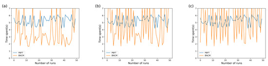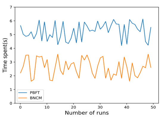 Finally, after analyzing the experimental data, it is found that the average time for BNCM to reach consensus is 3.598 s, 4.615 s, and 5.579 s in Figure 14a–c. The time for the PBFT algorithm to reach consensus has been stable at 5.261 s. We can infer that when the failure rate of BDER increases, the advantage of BNCM slowly diminishes. When the failure rate of BDER reaches 60%, the PBFT algorithm is more efficient. We can conclude that when the failure rate of f nodes in the system increases, the efficiency of BNCM will gradually decrease. Eventually, BNCM will lose its efficiency. Overall, BNCM is more efficient than traditional PBFT algorithms.