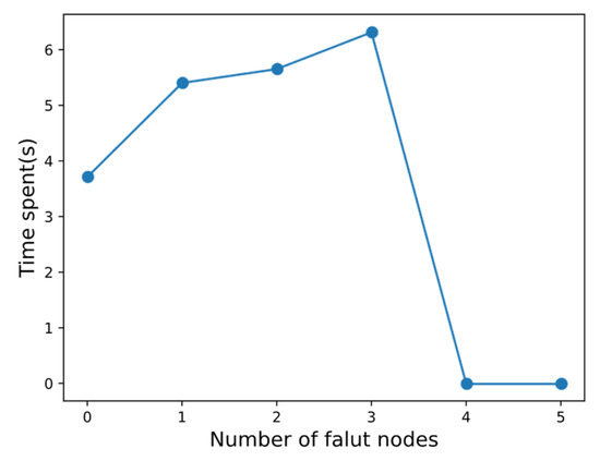 In order to test the fault tolerance of BNCM in VPPTM, a virtual power plant operator and nine DERs were set up in this experiment. In other words, the number of nodes participating in reaching a consensus in the system is 10. Let the number of fault nodes be set to 0, 1, 2, 3, 4, and 5 in turn, and count the time it takes to reach a consensus.