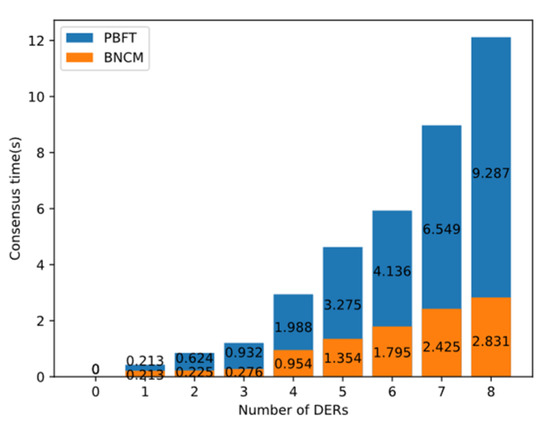As shown in Figure 15, the consensus completion time of the PBFT algorithm is longer, while the consensus completion time of BNCM is shorter. As the number of DERs increases, the advantages of BNCM become more obvious. When the number of nodes in the experiment is eight, the average consensus completion time of the PBFT algorithm is 9.2 s, and the average completion time of BNCM is 2.99 s. Through the experiment, it can be concluded that the performance of BNCM is better than that of PBFT algorithm.