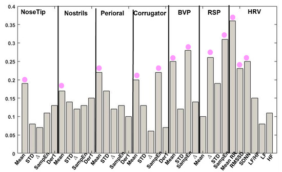 | BVP, RSP, IR (× 4 ROIs) | STD | Signal’s standard deviation |