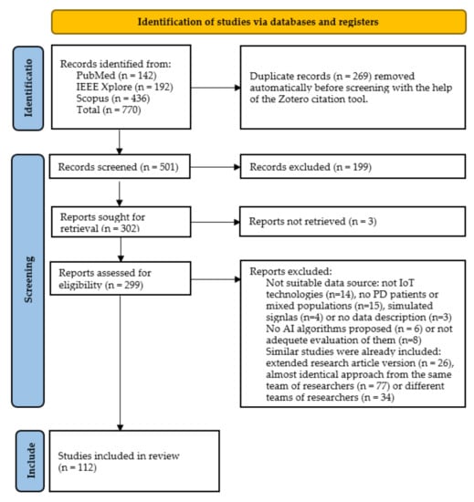 Then, the most suitable keywords were selected, to assure the inclusion of studies that would answer the posed research questions. Indicative such terms are “Parkinson’s disease”, “artificial intelligence”, “machine learning”, “deep learning”, “sensor”, “internet of tings” and some specific types of sensors, such as “accelerometer”, “gyroscope”, etc. All these terms were combined with logical expressions. Additionally, some other keywords were added, such as “remote”, “portable”, etc., to ensure that clinical equipment which cannot be deployed for remote diagnosis or monitoring would be excluded. The selection of the final technical keywords was based on methods and devices discussed in previous review articles, after several adjustments to ensure the inclusion of all the technologies of our interest. Finally, the considered studies should be articles published in journals or in conference proceedings in the last decade (from January of 2012 till August of 2021) and written in English. During the last decade, the exploitation of AI algorithms and IoT tools in healthcare was hyped. This period is also long enough to support a comprehensive review approach with concrete conclusions about the evolution of the respective methods proposed regarding PD over the years.