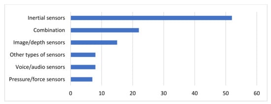 The types of sensors that are deployed for data collection and their popularity among the studies considered are depicted in Figure 3. As Figure 3 indicates, inertial sensors or IMUs, including accelerometers, gyroscopes and magnetometers are by far the most popular data source among the considered studies. Combination of different types of sensors follow in popularity, where again most of the times one from the multiple data sources used corresponds to inertial sensors. Moreover, data collected with image or depth sensors are another popular type of input data. On the other hand, speech recordings collected with audio or voice sensors and force signals collected with pressure sensors are more rarely encountered in the literature. Finally, it is worth mentioning that despite EEG, EMG and other medical signals are commonly used in the clinical practice for PD diagnosis, severity estimation and course prediction, there are very few studies considered that make use of portable biosensors, which monitor brain, heart or muscles functionality. These types of sensors fall in the less popular category, named as other, which includes besides portable EEG, sEMG and ECG devices, thermometers, galvanic response sensors, as well as flexion sensors, position sensors, encoders, tracking devices, time loggers, ambient sensors, including light, temperature, vibration sensors, etc.
