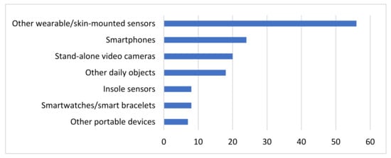 As Figure 4 indicates, the most widely encountered type of device in the literature corresponds to other wearable sensors or sensors that are mounted somehow to the patients’ corpus, e.g., via flexible bands, such as Shimmer3 or Physilog sensors. Mostly IMUs are embedded to this type of devices, but there are some other types of sensors and one reference to a pressure sensor that were embedded to these devices among the studies considered. The second most popular type of devices deployed is the smartphones. The smartphones are leveraged for their in-built sensors, which include but are not limited to IMUs, microphones, cameras and others. Stand-alone video cameras follow in popularity, including the Microsoft Kinect tool and the Leap Motion sensor, which are mainly used for video recordings but were also used once for speech recordings as well. Moreover, in 18 studies everyday objects that do not fall into other categories were deployed. For the specific studies considered in this review, these objects span across smart pens, keyboards, Wii controllers, support walkers and spoon handles. Various types of sensors, including inertial, pressure, audio and other are embedded to these objects. On the other hand, insole sensors are deployed solely for collecting gait-related pressure signals from the respective eight studies presented in Section 3.2.2. Similarly, smartwatches and smart bracelets are exploited almost exclusively for collecting inertial signals. Finally, in a few studies some other portable devices are used for speech recordings and other measurements.