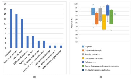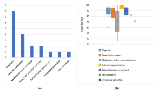 In the end, some other PD-related problems that can be addressed with image and depth sensors are presented in this paragraph. Firstly, Timed Up and Go (TUG) tests have been video-recorded to shed light on several PD manifestations. In [120], the subtasks of a TUG test are automatically segmented with the help of an LSTM, obtaining 93.1% accuracy. Furthermore, in [121] an RNN with gated recurrent units (GRUs) is deployed to detect FoG episodes based on video-recorded TUG tests. The respective classification performance reaches up to 82.5% accuracy. Another task addressed based on signals acquired with MS Kinect sensors is the estimation of the adherence to medication [122]. DTs, RFs and SVMs achieve that with accuracy greater than 67.7%, when personalized models are built. Finally, in [123] a virtual physical therapist is developed. In this case, the subtasks of the performed exercises are automatically segmented with HMMs, the patients’ performance is estimated with an SVM classifier, which achieves 86.3–94.2% accuracy, and finally, the next steps regarding the next exercise to perform are recommended again automatically with RFs.