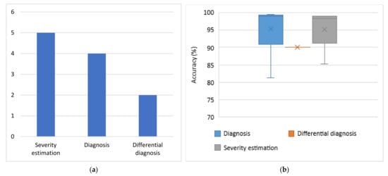 At the same time, these studies estimate the severity of PD-affected gait, with respect to the H&Y scale, achieving 98.57–99.1% [102], 85.3% [103] and 98.03–99.01% accuracy [104], respectively. In this case, the feed-forward DNN and the dual-modal CNN with the attention-enhanced LSTM clearly outperform the CNN approach, maintaining again an exceptionally high accuracy, greater than 98%. PD patients have been also classified according to their H&Y scores with the help of a time delay NN trained with Q-backpropagation [101] and an SVM classifier [105], obtaining 90.91–92.19% and 98.8% accuracy, respectively. Consequently, the SVM classifier demonstrates similar performance with the two previous DL approaches.