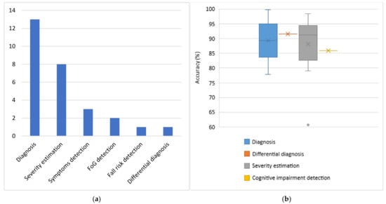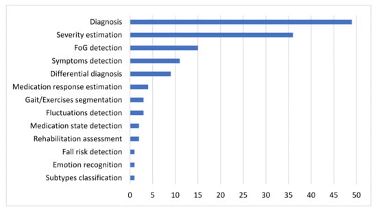 Nevertheless, there are some other preceding reviews that address this topic, following a similar approach [41,42,43,44,45,46,47]. However, the approach adopted herein is more comprehensive than most of these systematic reviews, as 112 studies are analyzed and considered, compared to 10–48 studies considered in previous approaches. Only Rovini et al. [41] examines 136 papers, but this systematic review was published in 2017 so naturally does not consider all approaches published in the last four years. Moreover, the review presented in this paper sheds light on additional questions, such as which the most commonly addressed problems regarding PD are, which the most deployed sensors are, and which the most used and best-performing ML algorithms are. Finally, the review of this paper highlights not only the added value of these interventions, but also the challenges and the potential pitfalls that they involve, as well as some gaps and open issues, proposing some future directions for improvement.
