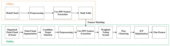 Our work is based on the method proposed by Drost et al. []. Through the improvement and optimization of the PPF, 6D poses of target objects can be accurately achieved in complex industrial scenarios, enabling the robotic arm to complete the bin-picking tasks. The flow chart of the proposed method is shown in Figure 1, which comprises offline phase and online phase.