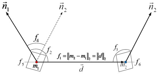 The proposed Cur-PPF is a six-dimensional feature vector using the distance information of two points and its normal vector and average curvature. Compared with the original PPF, curvature information is introduced in the proposed method, which enhances the feature description of point-pairs. Cur-PPF is shown in Figure 3. For any point-pair , and are two points in the model point cloud, and are the normal vectors of these two points, and are average curvatures of the two points, vector , feature expression is: