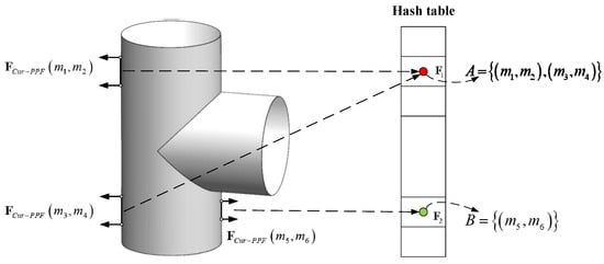 where represents the Euclidean distance between the two points, denotes the angle between two vectors. It should be noted that the feature is asymmetric, just as and are not the same. In the offline stage, the model point cloud is represented with a set of similar features . Here we set the steps of distance, angle and curvature to , , and . Then point-pairs with similar characteristics are placed in the same slot of the hash table, and the keys of the hash table are characteristics of point-pairs, as shown in Figure 4. The model features can be searched in constant time by using as the key to access the hash table.
