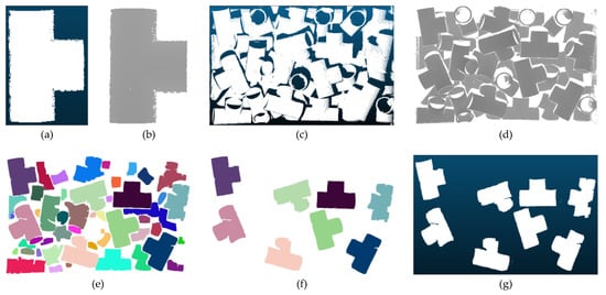The process of point cloud segmentation and candidate targets selection. (a) is the point cloud of the one-sided model; (b) is the grayscale image of the one-sided model; (c) is the point cloud of the scene; (d) is the grayscale image which is mapped from the depth information of the scene; (e) is the grayscale image of the scene after segmentation; (f) is the grayscale image of the scene after target selecting; and (g) is the point cloud which is mapped by (f).