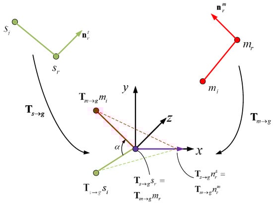 where, is a transformation with rotation and translation, which translates the reference point in the model point-pair feature to the origin of the coordinate system, and at the same time rotates the normal vector of the reference point to the same direction as the of the coordinate system. is also a transformation with rotation and translation, which translates the reference point in the model point-pair feature to the origin of the coordinate system, and at the same time rotates the normal vector of the reference point to the same direction as the of the coordinate system. is the inverse of . is the rotation around the with angle .
