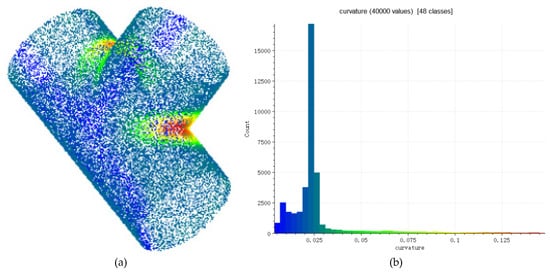 (a) is the curvature distribution of the three-way tube model. The color from red to blue corresponds to the average curvature of the point cloud from large to small. (b) is the curvature histogram of the three-way tube. According to the curvature histogram, we set 0–0.035 as the low-curvature range, and greater than 0.1 as the high-curvature range.