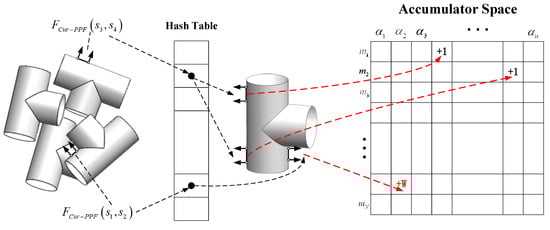 Voting process is completed through a two-dimensional accumulator. The rows of the accumulator is equivalent to the number of model points , and the columns is equivalent to the step length of the conversion relationship . Whenever scene point-pairs are successfully paired with model point-pairs in the hash table, the calculated are voted. The difference from the PPF is that our method combines the model curvature distribution in the actual voting process, and different votes are assigned different weights. When scene point-pairs and model point-pairs are successfully paired, we will focus on the relationship between the point and the point in the model point-pair . From Section 2.1.1, the average curvature value of each point in the model point cloud can be calculated. The curvature distribution of the three-way tube model is shown in Figure 7a. Different colors represent the average curvature value. It can be seen from characteristics of curvature that point cloud with similar curvature values is also similar in bending, and such point cloud is distributed in the same area in space. And point cloud with large differences in curvature values also has large differences in the degree of bending, and such point cloud is distributed far apart in space. We believe that point-pairs with the greater difference in curvature values of the two points contain more information, and the mapping relationship is calculated by the pairing is more accurate, such that should be given a higher weight when voting, as shown in Formula (8). For example, in the three-way tube model of this experiment, the high-curvature part and low-curvature part of the model are divided according to the curvature histogram. The curvature histogram is shown in Figure 7b. Weighted vote is performed on the calculated that has a greater difference in curvature values between the two points in the model point-pair. The voting process is shown in Figure 8.