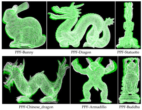 The PPF algorithm is used to register the six kinds of point cloud models of the data set. The pose results are used to convert the point cloud of the models into scene space, and the color is used for rendering, where white represents the point cloud of the scene, and green represents the converted model point cloud.