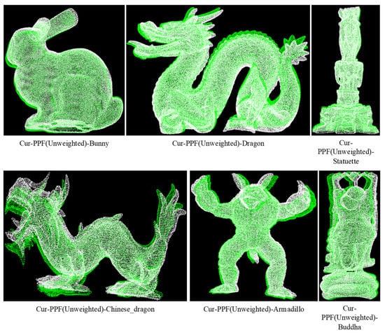 We verified the enhancement effect of curvature on the PPF description in the proposed method. Each model in the Retrieval data set corresponds to multiple scenes with different levels of noise. In order to reduce the impact of noise on the matching effect, a scene with a noise coefficient of 0.1 was selected for matching. The final matching rate is the average one between each model and multiple scenes, and the average of matching time with multiple scenes is viewed as the final time. The radius of curvature of models in the data set was set to 15 mm. Due to the different curvature distributions of each model, the curvature steps of Bunny, Dragon, Statuette, Chinese_Dragon, Armadillo, and Buddha were set to 0.07, 0.1, 0.13, 0.15, 0.2, and 0.11, respectively. The matching experiments of the PPF algorithm and the Cur-PPF (unweighted) algorithm were carried out respectively. A set of matching effects are shown in Figure 10 and Figure 11. Table 1 and Table 2 are the data comparison between the PPF algorithm and the Cur-PPF (unweighted) algorithm in terms of matching rate and time. The experimental results show that the introduction of curvature information can strengthen the description of the feature, and it is better than the original PPF algorithm in terms of matching rate and time.