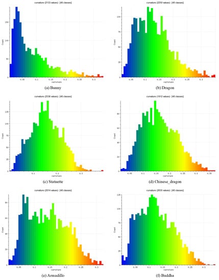 Curvature histograms of six models. The curvature of each model is divided into high/low part according to curvature histograms. (a) is the curvature histogram of Bunny model. Its high-curvature part is greater than 0.2 and the low-curvature part is 0–0.02; (b) is the curvature histogram of the Dragon model. Its high-curvature part is greater than 0.22 and the low-curvature part is 0–0.07; (c) is the curvature histogram of the Statuette model. Its high-curvature part is greater than 0.2 and the low-curvature part is 0–0.1; (d) is the curvature histogram of the Chinese_dragon model. Its high-curvature part is greater than 0.24 and the low-curvature part is 0–0.1; (e) is the curvature histogram of Armadillo model. Its high-curvature part is greater than 0.18 and the low-curvature part is 0–0.07; (f) is the curvature histogram of Buddha model. Its high-curvature part is greater than 0.18 and the low-curvature part is 0–0.07.
