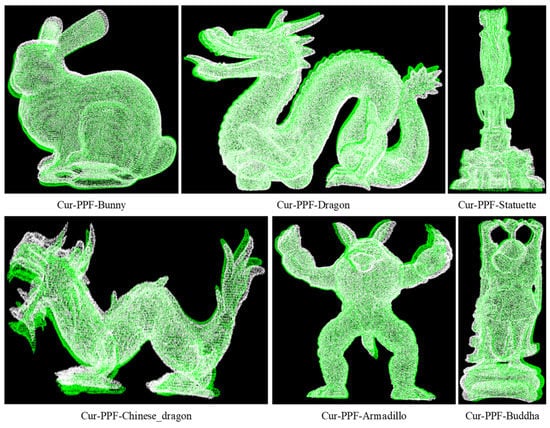 The Cur-PPF(Unweighted) algorithm is used to register the six kinds of point cloud models of the data set. The pose results are used to convert the point cloud of the models into scene space, and the color is used for rendering, where white represents the point cloud of the scene, and green represents the converted model point cloud.