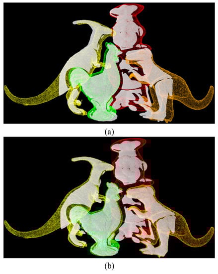 (a) is the result of using our proposed Cur-PPF algorithm to recognize different objects in the same scene, and (b) is the registration result of Figure (a) after optimization by the traditional ICP algorithm.