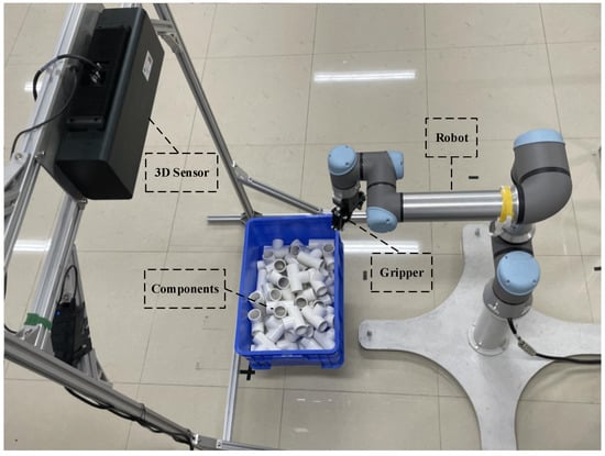 In order to verify the validity of the method proposed in this article, we used a six-axis robotic arm to perform bin-picking. In this system, the model of the robotic arm is UR5e (UNIVERSAL ROBOTS), the model of the gripper is AG-95 (DH ROBOTS), and the model of the 3D sensor is COMATRIX-IM (COBOT). Our experiment was carried out indoors. The light source is indoor incandescent lamp, and no specific light source is added.