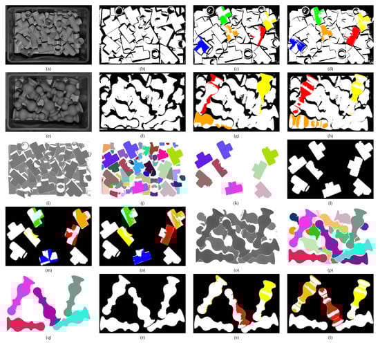 The matching process of the PPF algorithm and the Cur-PPF algorithm for two common objects in the industry. Among them, (a) is the three-way tube (the first type of objects); (e) is the upright column (the second type of objects); (b,f) correspond to the scene point cloud of two types of objects, the outer frame of the box is filtered out by setting thresholds on , respectively; (c,g) are matching results of the PPF algorithm for two types of objects; (d,h) are matching effect pictures after ICP correction; (i,o) are mapped from point cloud depth information to grayscale images; (j,p) are grayscale images after segmentation; (k,q) are candidate objects that are screened out according to the number of pixels in the segmented image; (l,r) are point clouds of candidate objects; (m,s) are the point cloud matching effect diagrams of the Cur-PPF algorithm; and (n,t) are matching effect pictures after ICP correction. The matching rate from high to low is rendered in the order of red, orange, yellow, green, and blue.