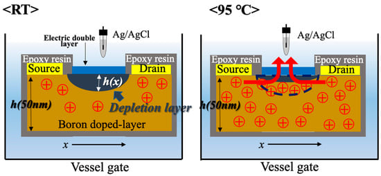 where is electric constant, V(x) is the channel potential, Vbi is the built-in voltage, VG is the gate voltage, and is the concentration of activated boron. This formula suggests that the thickness of the depletion layer decreases as boron in the channel is activated. The amount of boron that was ionized increased as the temperature rises, and the boron that was in the depletion layer was ionized, which made the depletion layer thinner, as shown Figure 3. However, this gate leakage current distinctively occurred at a higher forward bias of this diode. The BDD SGFET used in this study had a gate length of 200 μm, so by passing this to about 5 μm, the gate leakage current could be increased, as shown in this reference [28]. The results showing that BDD SGFETs operated in harsh environments at 95 °C indicate that BDD SGFETs are great candidates for high-temperature pH measurement.
