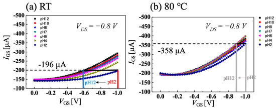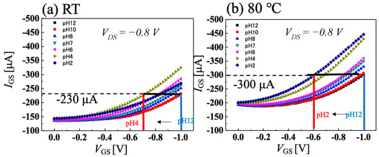 pH measurement using Ag/AgCl electrode at VDS = −0.8 V when solution temperature is (a) room temperature and (b) 80 °C.