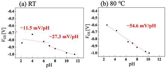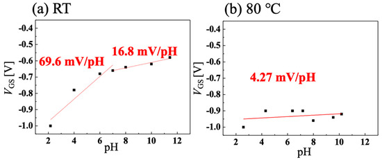 pH measurement using vessel gate at VDS = −0.8 V when solution temperature is (a) room temperature and (b) 80 °C.