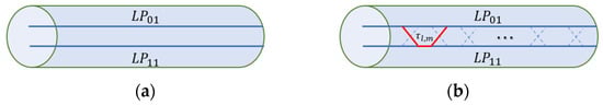 There is no mode coupling between modes in the ideal FMF, and the information in modes is transmitted independently, as Figure 1a shows. In the real fiber, coupling between different modes or polarization states will occur with power exchanging and crosstalk due to the existence of perturbation [], as Figure 1b shows.