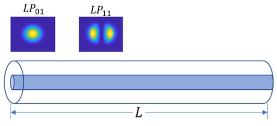 Taking a 2-mode fiber (TMF, a commonly used FMF) with a length of , as an example, as Figure 3 shows, 2 modes are excited at the input side (), the optical beam propagating through the optical fiber of length L at the output side (. (1) and (2) are the distribution expression of the electric field at the input and output side, (3) is the distribution of the intensity field at the output side calculated from the complex conjugate of the electric field.