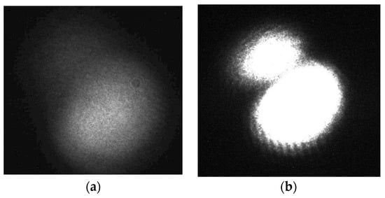 Then, the parameters of the CCD camera, such as the CCD camera gain (dB), the shutter time (ms), the optical output power (dBm ×100), need to adjust to suitable values for keeping the quality of collected images, which means making all pixel values of collected images are lower than 255, as Figure 5a shows. Otherwise, the image collected will be oversaturated and cannot be processed, as Figure 5b shows.