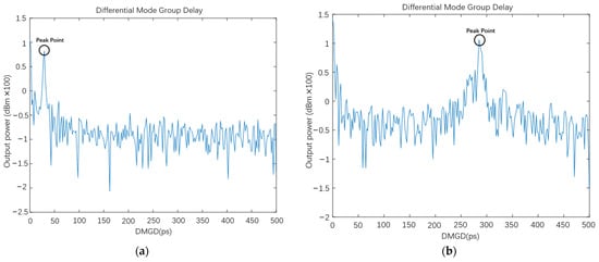 The DMGD values of the peak points in Figure 8a,b represent mode dispersion between the FM and HOM and between different HOMs of the FUT. In this experiment, only one peak point represents the mode dispersion between the FM and HOMs because utilized FUT is a TMF. From the peak points shown in Figure 8a,b, the DMGD of our TMF under 10 m and 100 m is 29.6929 ps and 287.1094 ps, respectively, which is a 10-fold relationship approximately. Therefore, the mode dispersion of the TMF is 2.9 ps/m, corresponding with fiber parameters.