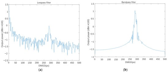 Meanwhile, because comprises optical field interference of , which is the content of the peak part in Figure 8a,b, the bandpass filter is used to extract the HOM content of . In the bandpass filter, the center frequency is set to the DMGD value, which is the peak point in Figure 8a,b, and the bandwidth of the bandpass filter is set to a small range on both sides of the peak. Then, the intensity distribution and the multi-path interference (MPI) value are calculated by (14) and (15). The low-pass filter and the bandpass filter results of the 100 m FMF are shown in Figure 9a,b. The integral of curves derived from the low-pass and bandpass filter, which means their area under the curves, is calculated. Then, the results are substituted into (13), (14), (15) and obtains the value of , , and MPI.