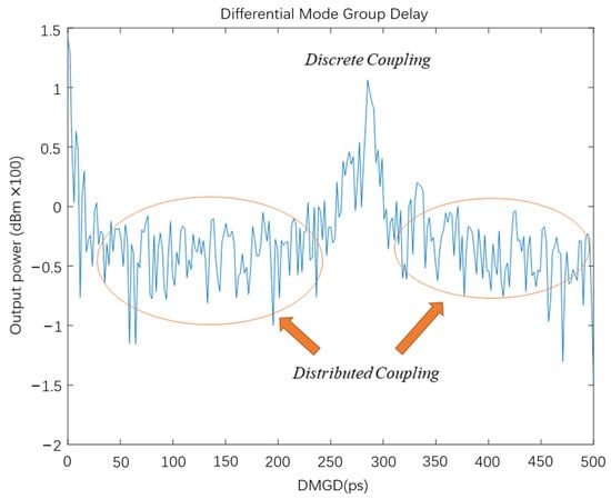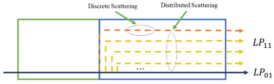 This situation occurs at the input side of the FMF, and the input optical beam is scattered into the FM and HOM of the FMF, called discrete scattering. Distributed scattering describes the power scattering between modes in the FMF because of the imperfection of the fiber structure, the uneven distribution of the refractive index, and the non-ellipticity of the fiber. Therefore, the distributed scattering occurs in the entire optical fiber, different from the discrete scattering. The conceptual diagram of the discrete and distributed scattering of the 100 m TMF is shown in Figure 10.