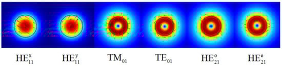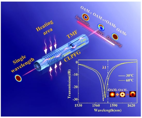 The schematic diagram of the operation principle is shown in Figure 1. The sensing system is composed of an OAM mode generator and a section of TMF. In this work, the OAM mode generator is a CLFPG, which was fabricated by twisting molten single-mode fiber (SMF-28e) at high temperatures. As illustrated in the inset of Figure 1, when the grating pitch of the CLPFG is 530 µm, the resonant wavelength is 1572.5 nm and the dip loss is 31.2 dB, thus directly coupling the OAM0 to the OAM1 mode with high efficiency. When the incident light is located at the resonant wavelength of CLPFG, the fundamental mode of the fiber, that is, the OAM0 mode, is completely transformed into the OAM1 mode by the CLFPG. As shown in Figure 2, it can be calculated, by finite element analysis, that TMF (14 µm/125 µm for core/cladding diameter) can support the vector modes of HE21even, HM21odd, TE01, and TM01, which can be superimposed into the OAM1 mode. Therefore, the TMF is fused at the back end of CLFPG, which can transmit the OAM mode excited in CLPFG within a certain distance. At the back end of the TMF, only the ring-shape mode profile belonging to the OAM1 mode can be seen. When the wavelength of the input light is far from the grating loss dip, the OAM0 mode can be seen at the back end of TMF. When the input light has a wavelength within the loss dip bandwidth, a part of the OAM0 mode energy is coupled to the OAM1 mode. At this time, the OAM0 and OAM1 mode coexist. After they are transmitted through the TMF, mode interference occurs at the output end, and the coherent superposition state of the two modes is observed.